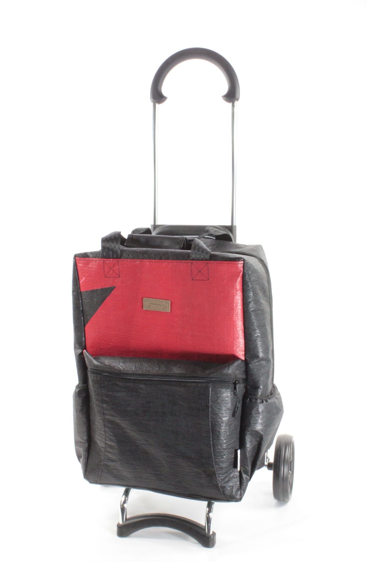Tragegurte heraus nehmen, einfach unten anclicken und du kannst den ganzen Einkaufskoffer als Rucksack ohne das Gestell tragen.