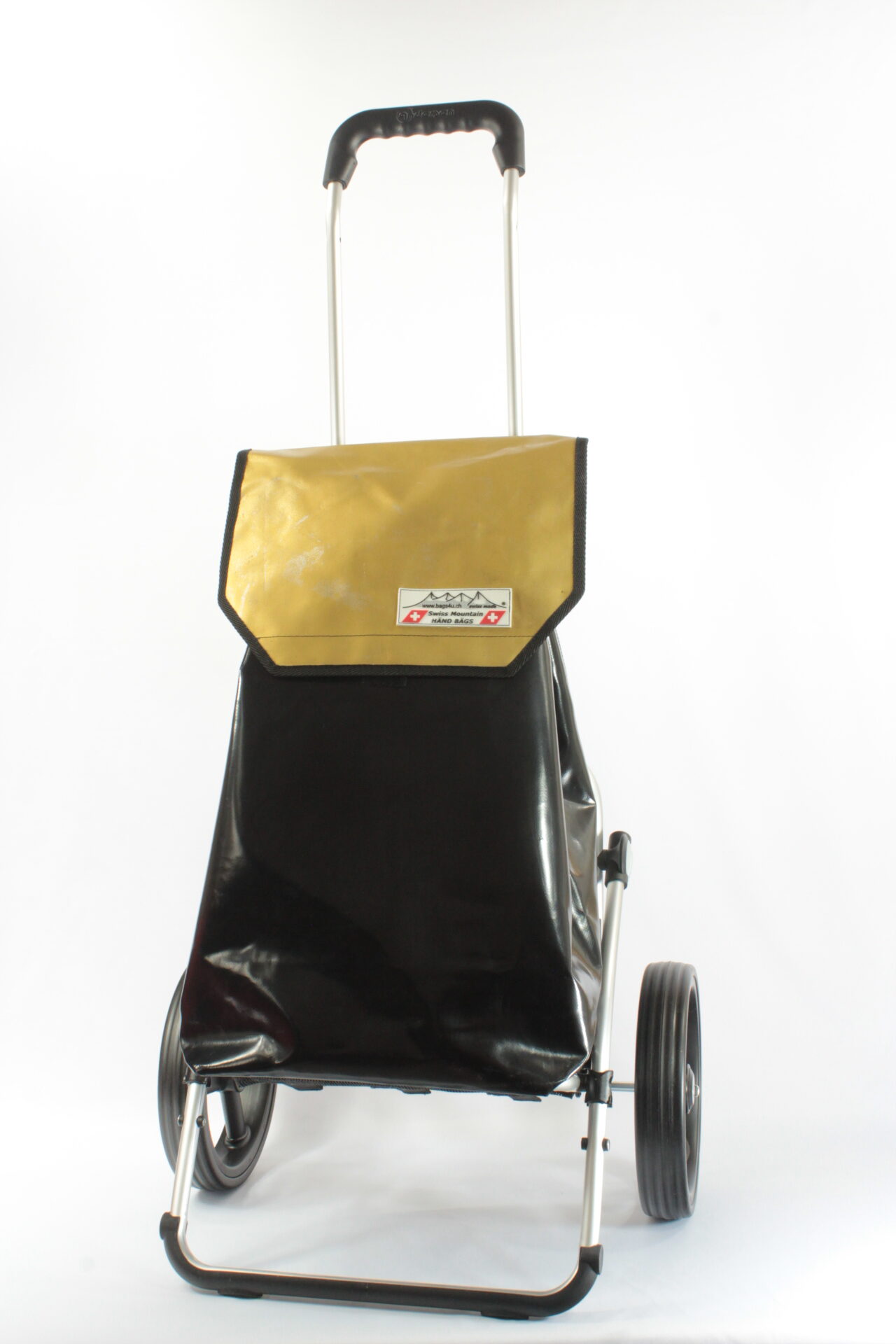 Der Swiss Mountain Einkaufswagen „ROYAL“ hat ein hochwertiges Aluminiumgestell der Deutschen Firma Andersen. Die 2 Dreispeichen-Räder haben einen Durchmesser von ca. 25 cm und haben einen komfortablen Rollenlauf. Mit dem breiten Klappgriff, welcher auf bequeme 110 cm ausgeklappt wird steuern Sie das Wägeli souverän. Der Boden ist vergrößerbar und einklappbar. Die getestete Tragfähigkeit ist 30 Kg.