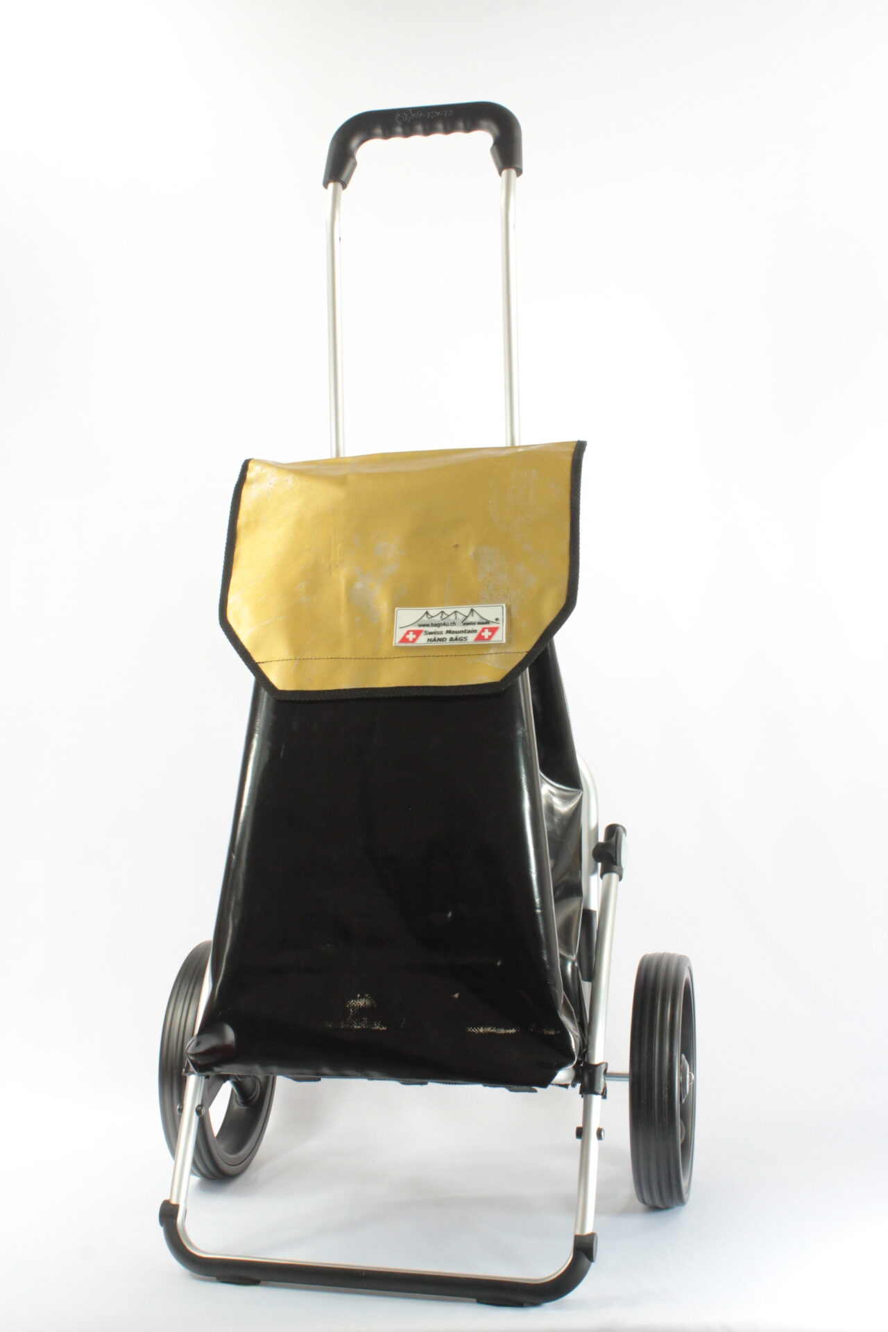 Der Swiss Mountain Einkaufswagen „ROYAL“ hat ein hochwertiges Aluminiumgestell der Deutschen Firma Andersen. Die 2 Dreispeichen-Räder haben einen Durchmesser von ca. 25 cm und haben einen komfortablen Rollenlauf. Mit dem breiten Klappgriff, welcher auf bequeme 110 cm ausgeklappt wird steuern Sie das Wägeli souverän. Der Boden ist vergrößerbar und einklappbar. Die getestete Tragfähigkeit ist 30 Kg.