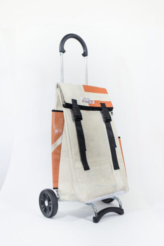 Durch aufreissen von 2 Klettbandverschlüssen kann man den Shopper-Bag vom Wägelchen abnehmen und diesen Shopper-Bag als Rucksack verwenden, da an der Rückseite des Shopper-Bags zwei 4 cm Breite und in der Länge verstellbare Tragegurten angebracht sind.