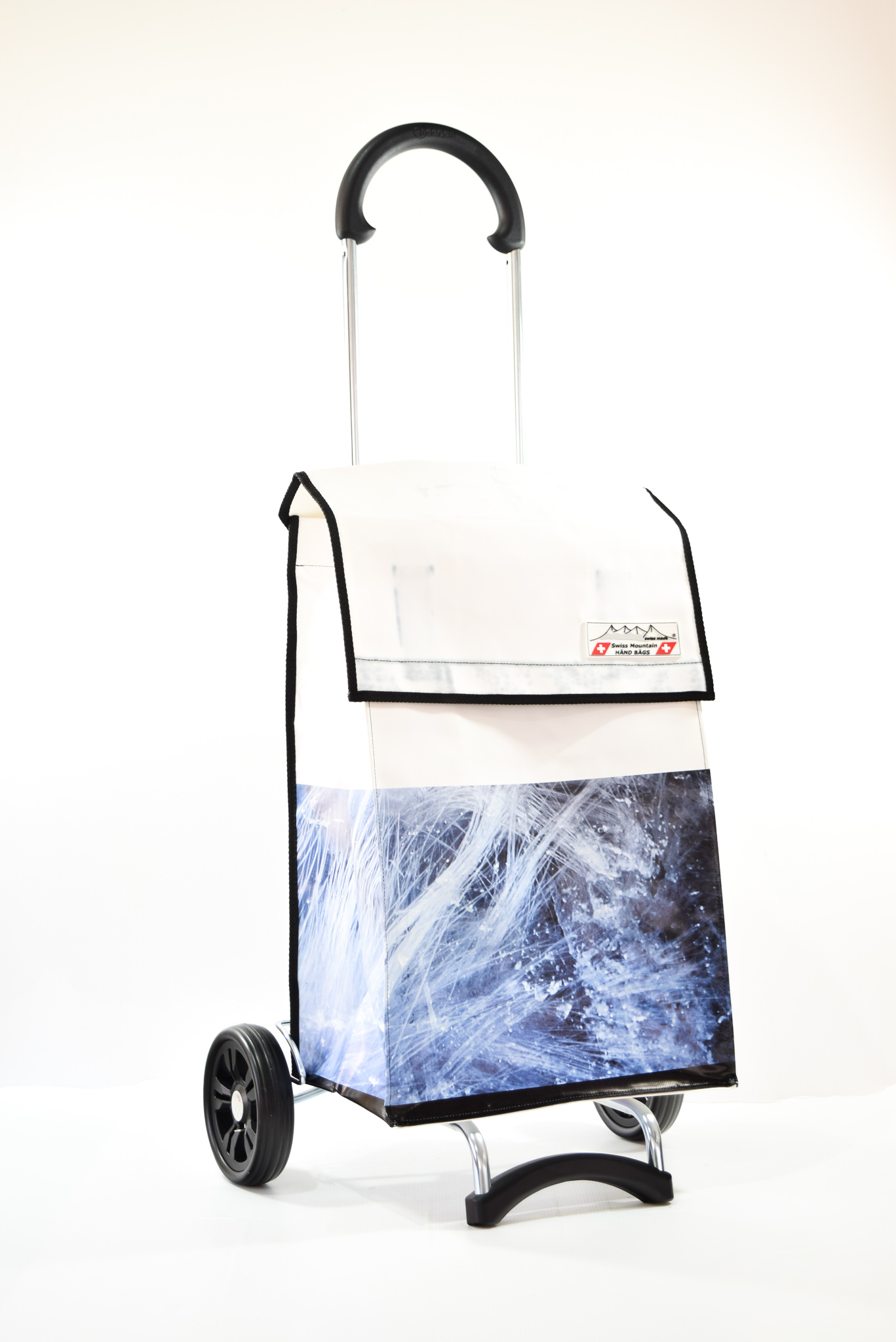 Der Swiss Mountain Einkaufswagen Quadro ist zusammenklappbar. Das Wägelchen-Gestell ist auch ein Markenprodukt der Swiss Mountain . Die 2 Räder haben einen Durchmesser von ca. 18 cm und haben einen konfortablen Rollenlauf.Der Shopperwagengriff ist in 3 Stufen verstellbar in Teleskop-Version. Die getestete Tragfähigkeit ist 40 Kg. An der einen Seite des Einkaufs-Bags befindet sich ein Regenschirmhalter, in den jeder Damen oder Herrenschirm passt. Dieser ist unten offen, so, dass jegliches Regenwasser unten bequem auslaufen kann. Im Innern des Shopper-Bags befindet sich ausserdem noch ein Innenfach ( ca. 17 cm x 21 cm ), das durch einen Reissverschluss zu öffnen oder zu schliessen ist.