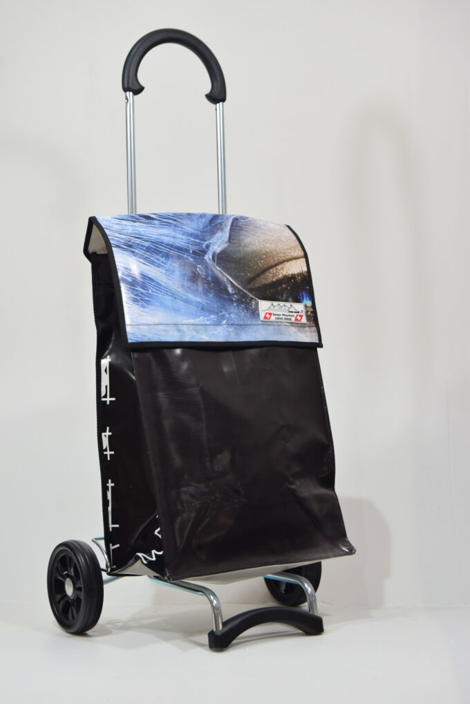 Der Swiss Mountain Einkaufswagen Quadro ist zusammenklappbar. Das Wägelchen-Gestell ist auch ein Markenprodukt der Swiss Mountain . Die 2 Räder haben einen Durchmesser von ca. 18 cm und haben einen konfortablen Rollenlauf.Der Shopperwagengriff ist in 3 Stufen verstellbar in Teleskop-Version. Die getestete Tragfähigkeit ist 40 Kg. An der einen Seite des Einkaufs-Bags befindet sich ein Regenschirmhalter, in den jeder Damen oder Herrenschirm passt. Dieser ist unten offen, so, dass jegliches Regenwasser unten bequem auslaufen kann. Im Innern des Shopper-Bags befindet sich ausserdem noch ein Innenfach ( ca. 17 cm x 21 cm ), das durch einen Reissverschluss zu öffnen oder zu schliessen ist.