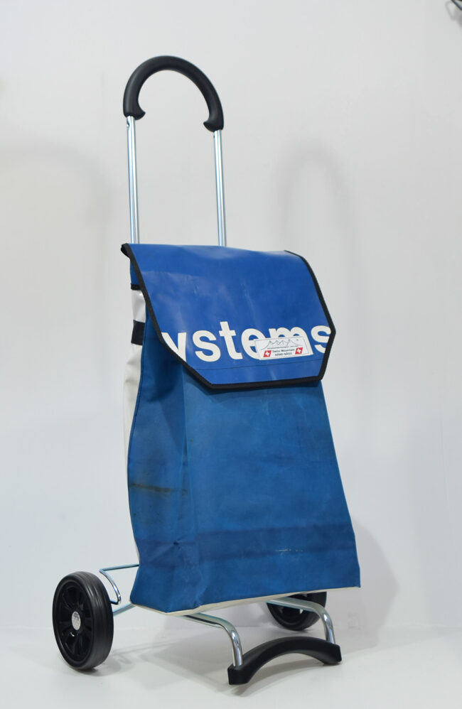 Durch aufreissen von 2 Klettbandverschlüssen kann man den Shopper-Bag vom Wägelchen abnehmen und diesen Shopper-Bag als Rucksack verwenden, da an der Rückseite des Shopper-Bags zwei 4 cm Breite und in der Länge verstellbare Tragegurten angebracht sind.