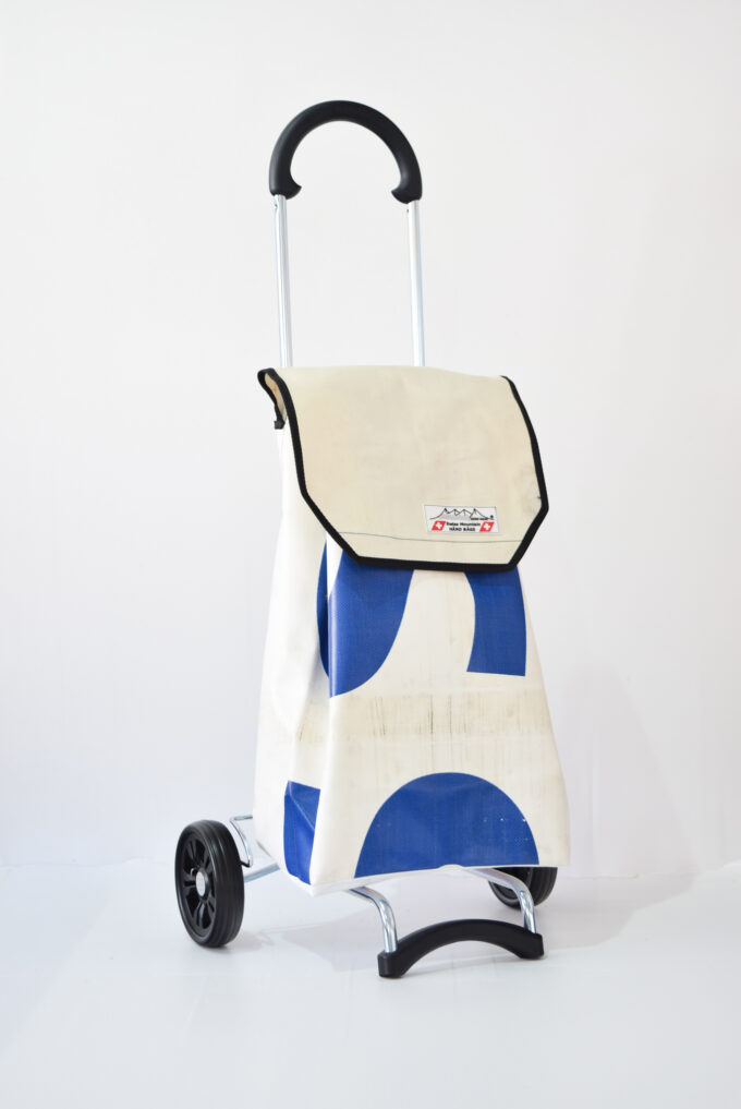 Durch aufreissen von 2 Klettbandverschlüssen kann man den Shopper-Bag vom Wägelchen abnehmen und diesen Shopper-Bag als Rucksack verwenden, da an der Rückseite des Shopper-Bags zwei 4 cm Breite und in der Länge verstellbare Tragegurten angebracht sind.