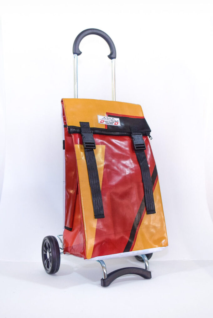 Der Einkaufswagen ist mittels eines massiven, robusten und teilbaren Reissverschluss oben verschliessbar, durch welchen man bis zu 1/4 mehr Innenvolumen erhält ( Bei aufgeklapptem Deckel ist der Wagensack ca. 17 cm höher und hat somit rund 25 % mehr Ladevolumen. Zusätzlich sind 2 verstellbare Klickverschlüsse an der Oberseite des Deckels befestigt, womit sich der Deckel verstellbar nach unten klappen und verschliessen lässt.