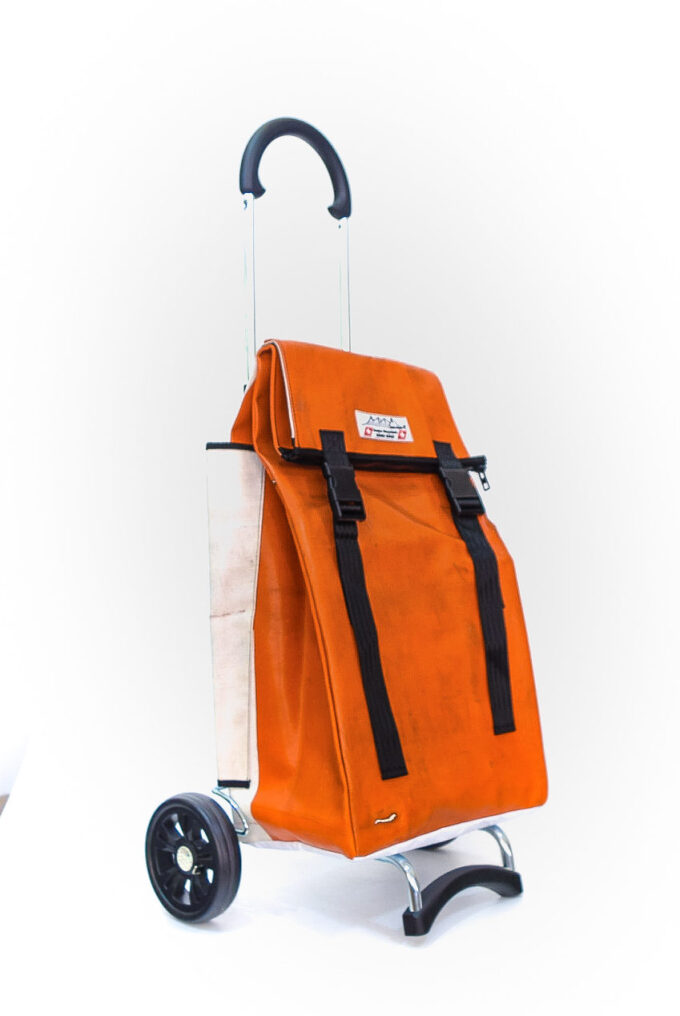 Durch aufreissen von 2 Klettbandverschlüssen kann man den Shopper-Bag vom Wägelchen abnehmen und diesen Shopper-Bag als Rucksack verwenden, da an der Rückseite des Zipper zwei 4 cm Breite und in der Länge verstellbare Tragegurten angebracht sind.