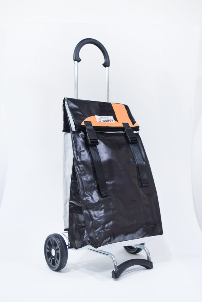 Der Einkaufswagen ist mittels eines massiven, robusten und teilbaren Reissverschluss oben verschliessbar, durch welchen man bis zu 1/4 mehr Innenvolumen erhält ( Bei aufgeklapptem Deckel ist der Wagensack ca. 17 cm höher und hat somit rund 25 % mehr Ladevolumen. Zusätzlich sind 2 verstellbare Klickverschlüsse an der Oberseite des Deckels befestigt, womit sich der Deckel verstellbar nach unten klappen und verschliessen lässt.