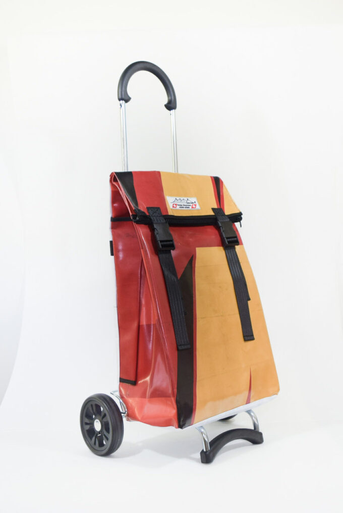 Der Einkaufswagen ist mittels eines massiven, robusten und teilbaren Reissverschluss oben verschliessbar, durch welchen man bis zu 1/4 mehr Innenvolumen erhält ( Bei aufgeklapptem Deckel ist der Wagensack ca. 17 cm höher und hat somit rund 25 % mehr Ladevolumen. Zusätzlich sind 2 verstellbare Klickverschlüsse an der Oberseite des Deckels befestigt, womit sich der Deckel verstellbar nach unten klappen und verschliessen lässt.