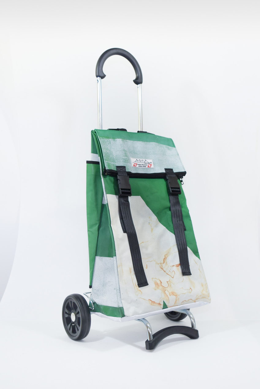 Durch aufreissen von 2 Klettbandverschlüssen kann man den Shopper-Bag vom Wägelchen abnehmen und diesen Shopper-Bag als Rucksack verwenden, da an der Rückseite des Zipper zwei 4 cm Breite und in der Länge verstellbare Tragegurten angebracht sind.