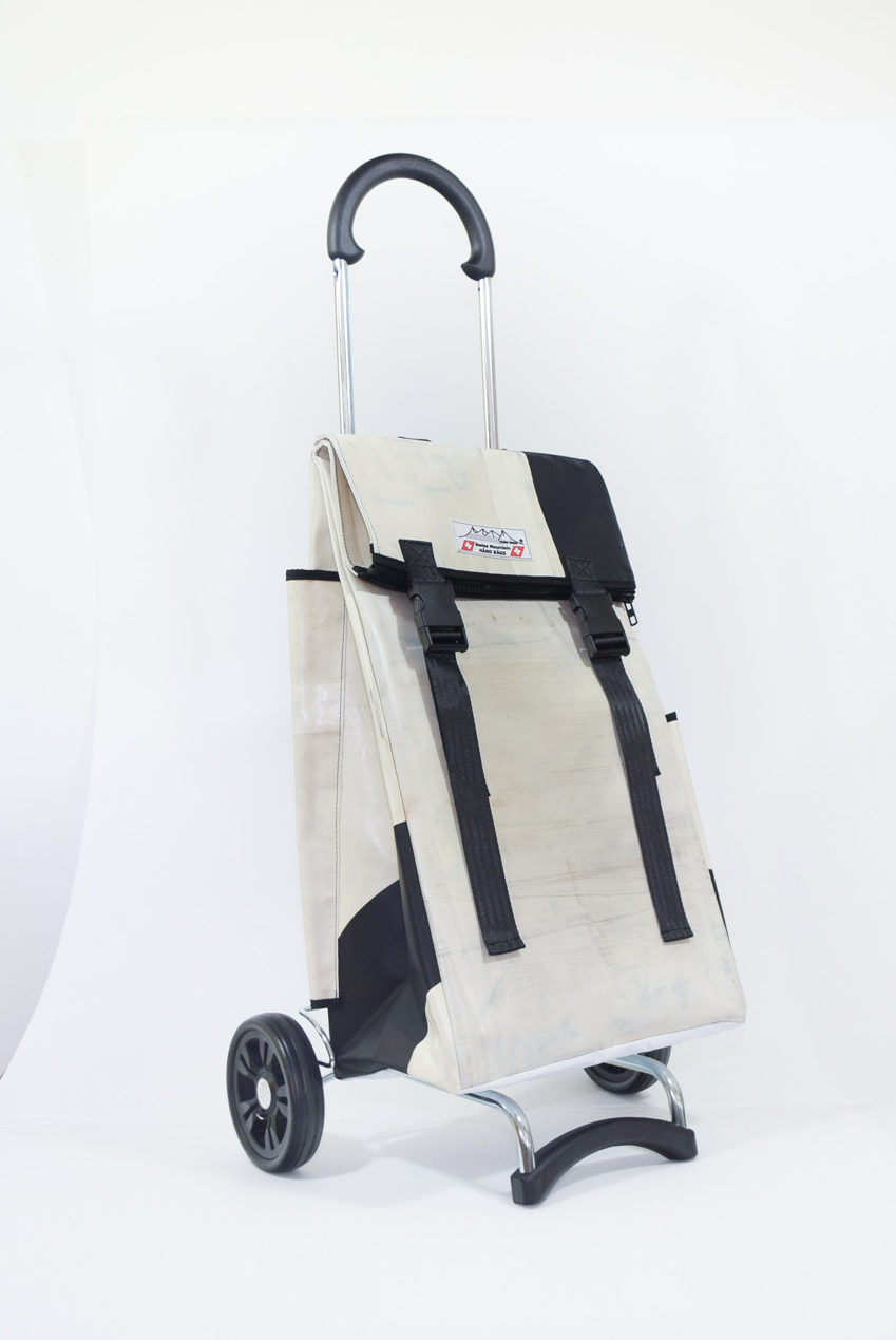 Durch aufreissen von 2 Klettbandverschlüssen kann man den Shopper-Bag vom Wägelchen abnehmen und diesen Shopper-Bag als Rucksack verwenden, da an der Rückseite des Zipper zwei 4 cm Breite und in der Länge verstellbare Tragegurten angebracht sind.