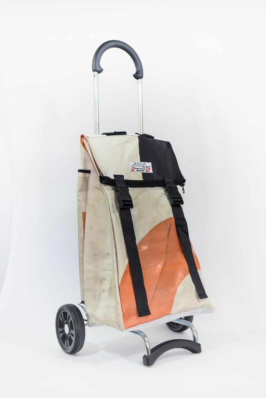 Der Swiss Mountain Einkaufswagen ist am Griff umklappbar. Das Wägelchen-Gestell ist auch ein Markenprodukt der Anderson. Die 2 Räder haben einen Durchmesser von ca. 16 cm und haben einen konfortablen Rollenlauf. Die getestete Tragfähigkeit ist 40 Kg. An der einen Seite des Einkaufs-Bags befindet sich ein Regenschirmhalter, in den jeder Damen oder Herrenschirm passt. Dieser ist unten offen, so, dass jegliches Regenwasser unten bequem auslaufen kann. Auf der gegenüberliegenden Seite findet sich ein grosses Flachfach.