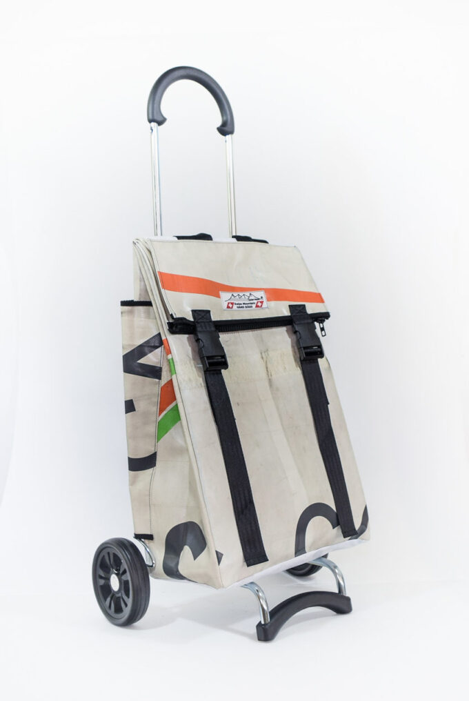 Durch aufreissen von 2 Klettbandverschlüssen kann man den Shopper-Bag vom Wägelchen abnehmen und diesen Shopper-Bag als Rucksack verwenden, da an der Rückseite des Zipper zwei 4 cm Breite und in der Länge verstellbare Tragegurten angebracht sind.