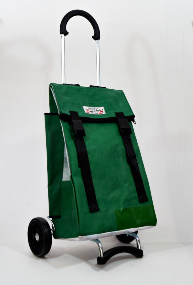Der Swiss Mountain Einkaufswagen ist am Griff umklappbar. Das Wägelchen-Gestell ist auch ein Markenprodukt der Anderson. Die 2 Räder haben einen Durchmesser von ca. 16 cm und haben einen konfortablen Rollenlauf. Die getestete Tragfähigkeit ist 40 Kg. An der einen Seite des Einkaufs-Bags befindet sich ein Regenschirmhalter, in den jeder Damen oder Herrenschirm passt. Dieser ist unten offen, so, dass jegliches Regenwasser unten bequem auslaufen kann. Auf der gegenüberliegenden Seite findet sich ein grosses Flachfach.