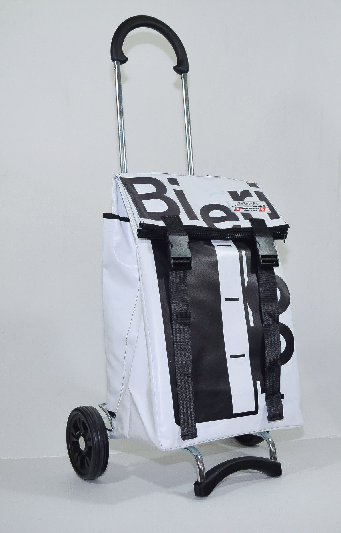 Der Swiss Mountain Einkaufswagen ist am Griff umklappbar. Das Wägelchen-Gestell ist auch ein Markenprodukt der Anderson. Die 2 Räder haben einen Durchmesser von ca. 16 cm und haben einen konfortablen Rollenlauf. Die getestete Tragfähigkeit ist 40 Kg. An der einen Seite des Einkaufs-Bags befindet sich ein Regenschirmhalter, in den jeder Damen oder Herrenschirm passt. Dieser ist unten offen, so, dass jegliches Regenwasser unten bequem auslaufen kann. Auf der gegenüberliegenden Seite findet sich ein grosses Flachfach.