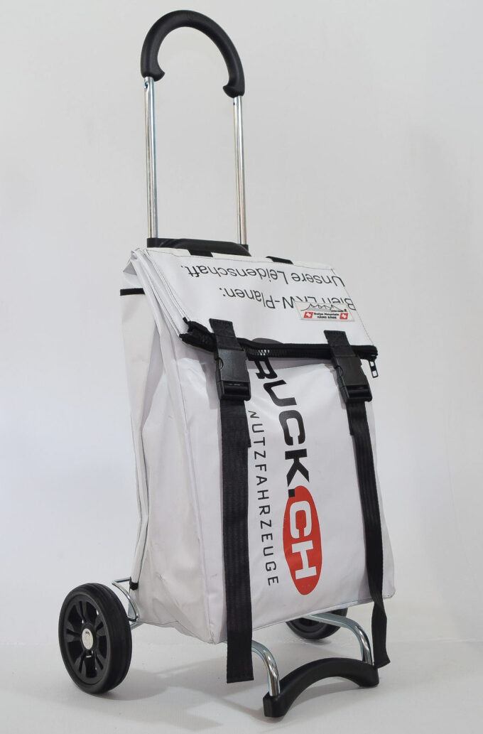 Der Einkaufswagen ist mittels eines massiven, robusten und teilbaren Reissverschluss oben verschliessbar, durch welchen man bis zu 1/4 mehr Innenvolumen erhält ( Bei aufgeklapptem Deckel ist der Wagensack ca. 17 cm höher und hat somit rund 25 % mehr Ladevolumen. Zusätzlich sind 2 verstellbare Klickverschlüsse an der Oberseite des Deckels befestigt, womit sich der Deckel verstellbar nach unten klappen und verschliessen lässt.