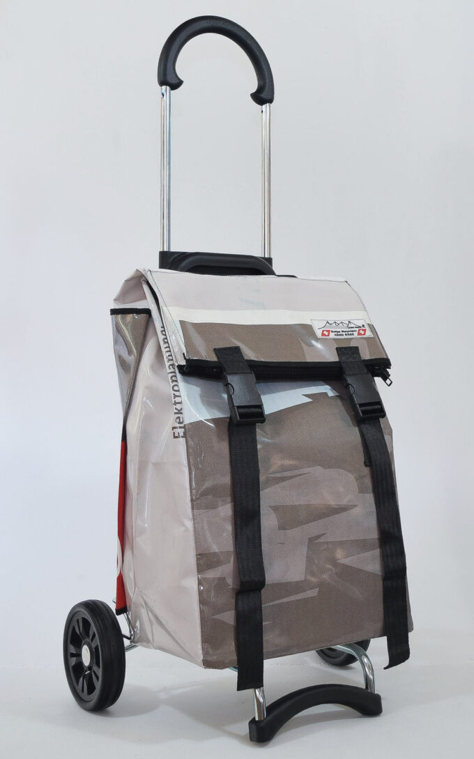 Durch aufreissen von 2 Klettbandverschlüssen kann man den Shopper-Bag vom Wägelchen abnehmen und diesen Shopper-Bag als Rucksack verwenden, da an der Rückseite des Zipper zwei 4 cm Breite und in der Länge verstellbare Tragegurten angebracht sind.