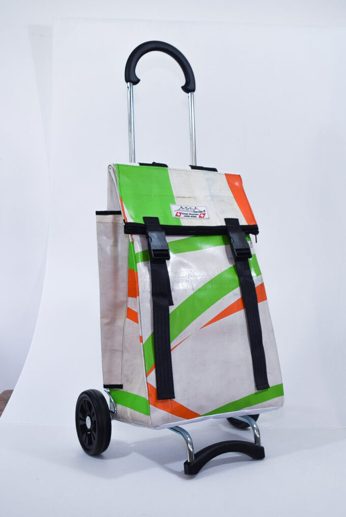 Durch aufreissen von 2 Klettbandverschlüssen kann man den Shopper-Bag vom Wägelchen abnehmen und diesen Shopper-Bag als Rucksack verwenden, da an der Rückseite des Zipper zwei 4 cm Breite und in der Länge verstellbare Tragegurten angebracht sind.