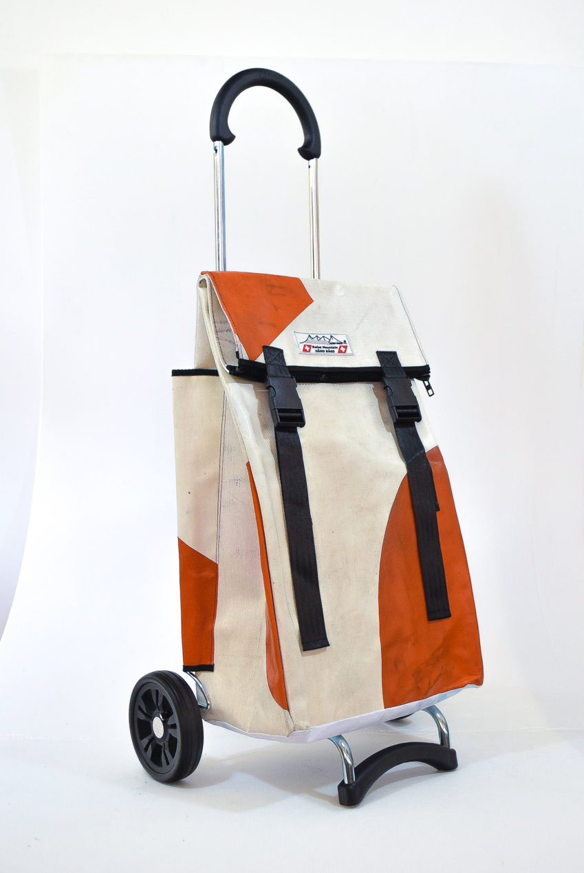 Durch aufreissen von 2 Klettbandverschlüssen kann man den Shopper-Bag vom Wägelchen abnehmen und diesen Shopper-Bag als Rucksack verwenden, da an der Rückseite des Zipper zwei 4 cm Breite und in der Länge verstellbare Tragegurten angebracht sind.