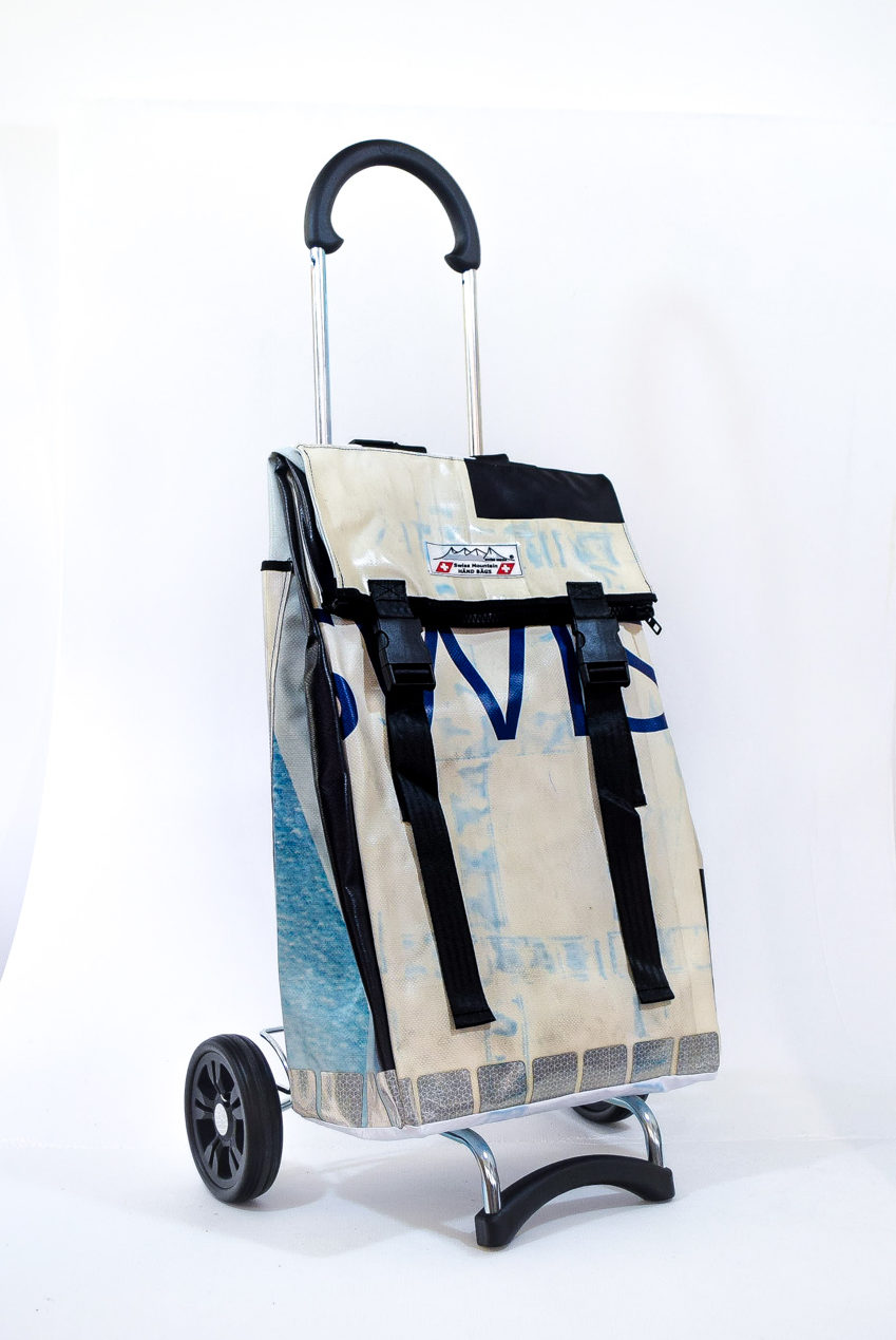 Durch aufreissen von 2 Klettbandverschlüssen kann man den Shopper-Bag vom Wägelchen abnehmen und diesen Shopper-Bag als Rucksack verwenden, da an der Rückseite des Zipper zwei 4 cm Breite und in der Länge verstellbare Tragegurten angebracht sind.