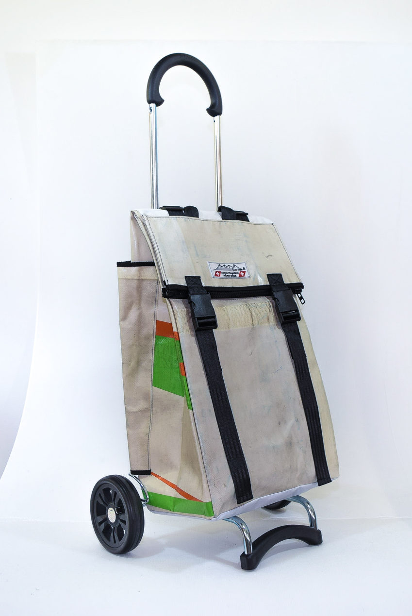 Durch aufreissen von 2 Klettbandverschlüssen kann man den Shopper-Bag vom Wägelchen abnehmen und diesen Shopper-Bag als Rucksack verwenden, da an der Rückseite des Zipper zwei 4 cm Breite und in der Länge verstellbare Tragegurten angebracht sind.