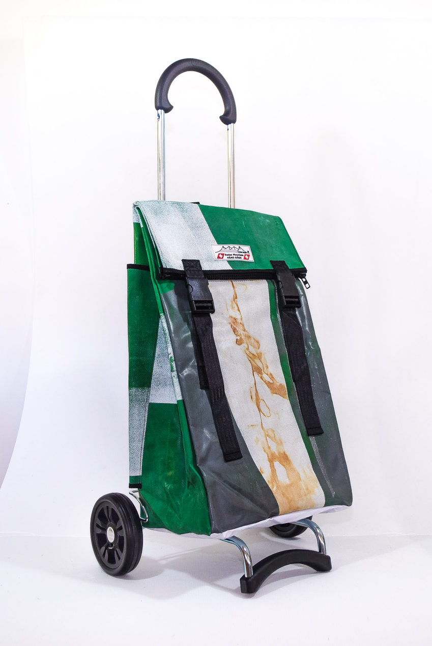 Der Swiss Mountain Einkaufswagen ist am Griff umklappbar. Das Wägelchen-Gestell ist auch ein Markenprodukt der Anderson. Die 2 Räder haben einen Durchmesser von ca. 16 cm und haben einen konfortablen Rollenlauf. Die getestete Tragfähigkeit ist 40 Kg. An der einen Seite des Einkaufs-Bags befindet sich ein Regenschirmhalter, in den jeder Damen oder Herrenschirm passt. Dieser ist unten offen, so, dass jegliches Regenwasser unten bequem auslaufen kann. Auf der gegenüberliegenden Seite findet sich ein grosses Flachfach.
