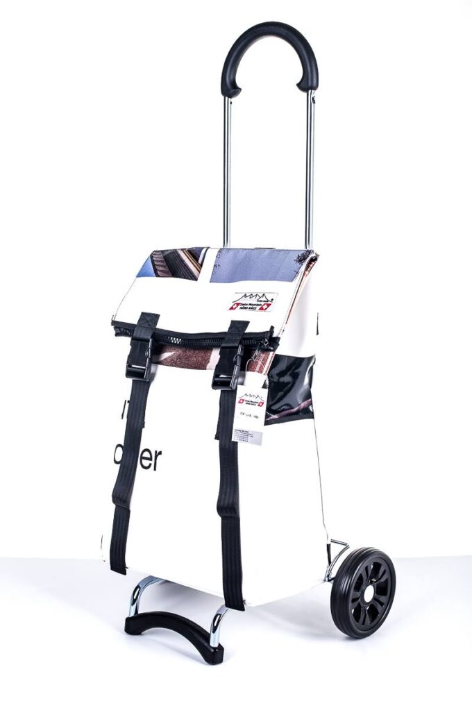 Der Swiss Mountain Einkaufswagen ist am Griff umklappbar. Das Wägelchen-Gestell ist auch ein Markenprodukt der Anderson. Die 2 Räder haben einen Durchmesser von ca. 16 cm und haben einen konfortablen Rollenlauf. Die getestete Tragfähigkeit ist 40 Kg. An der einen Seite des Einkaufs-Bags befindet sich ein Regenschirmhalter, in den jeder Damen oder Herrenschirm passt. Dieser ist unten offen, so, dass jegliches Regenwasser unten bequem auslaufen kann. Auf der gegenüberliegenden Seite findet sich ein grosses Flachfach.