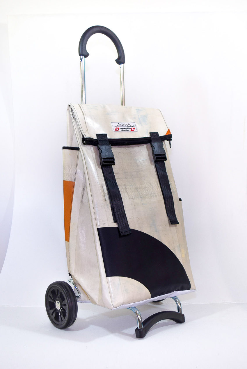 Durch aufreissen von 2 Klettbandverschlüssen kann man den Shopper-Bag vom Wägelchen abnehmen und diesen Shopper-Bag als Rucksack verwenden, da an der Rückseite des Zipper zwei 4 cm Breite und in der Länge verstellbare Tragegurten angebracht sind.