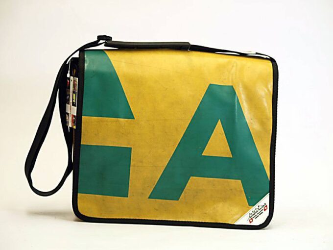 Masse in Cm: L= ca. 34.cm B= ca. 11 cm H= ca. 29 cm Diese Tasche ist aus gebrauchter LKW Plane und wurde in der Schweiz von Hand hergestellt.