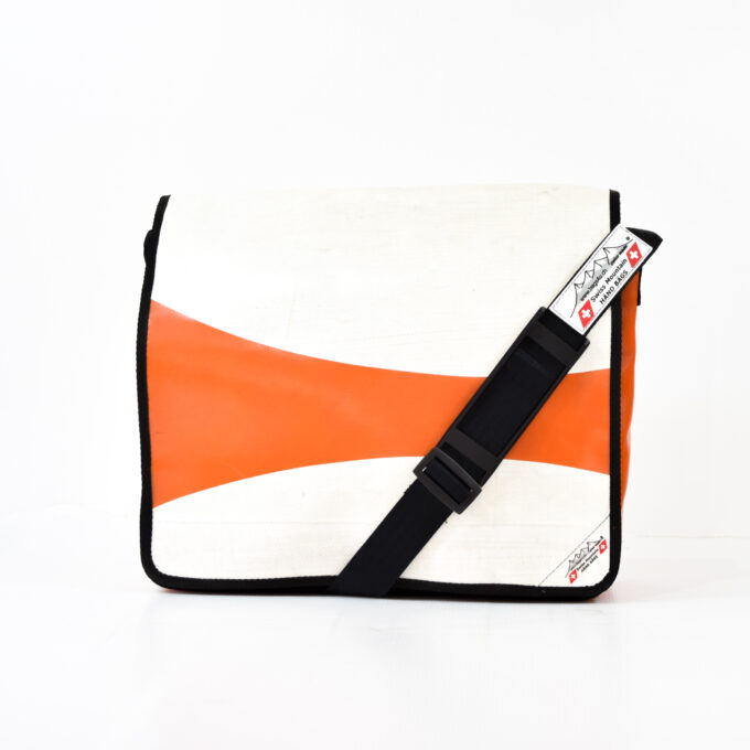 Diese Tasche ist aus gebrauchter LKW Plane und wurde in der Schweiz von Hand hergestellt.
