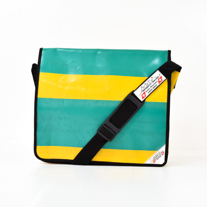 Diese Tasche ist aus gebrauchter LKW Plane und wurde in der Schweiz von Hand hergestellt.