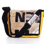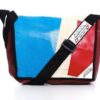 Diese Umhängetasche , Sidebag standard ,ist aus gebrauchter LKW Plane hergestellt.Er hat an der Rückeninnenwand ein zweigeteiltes Innenfach ( je ca. 20 x 16 cm ) Die Sidebag hat an der Front-Aussenwand unter dem Klappdeckel ein Handyfach, diverse Kugelschreiberfächer und ein Flatfach.