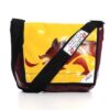 Diese Umhängetasche , Sidebag standard ,ist aus gebrauchter LKW Plane hergestellt.Er hat an der Rückeninnenwand ein zweigeteiltes Innenfach ( je ca. 20 x 16 cm ) Die Sidebag hat an der Front-Aussenwand unter dem Klappdeckel ein Handyfach, diverse Kugelschreiberfächer und ein Flatfach.