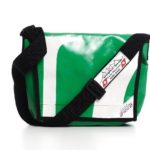 Diese Umhängetasche , Sidebag standard ,ist aus gebrauchter LKW Plane hergestellt.Er hat an der Rückeninnenwand ein zweigeteiltes Innenfach ( je ca. 20 x 16 cm ) Die Sidebag hat an der Front-Aussenwand unter dem Klappdeckel ein Handyfach, diverse Kugelschreiberfächer und ein Flatfach.