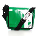 Diese Umhängetasche , Sidebag standard ,ist aus gebrauchter LKW Plane hergestellt.Er hat an der Rückeninnenwand ein zweigeteiltes Innenfach ( je ca. 20 x 16 cm ) Die Sidebag hat an der Front-Aussenwand unter dem Klappdeckel ein Handyfach, diverse Kugelschreiberfächer und ein Flatfach.