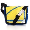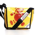 Diese Umhängetasche , Sidebag standard ,ist aus gebrauchter LKW Plane hergestellt.Er hat an der Rückeninnenwand ein zweigeteiltes Innenfach ( je ca. 20 x 16 cm ) Die Sidebag hat an der Front-Aussenwand unter dem Klappdeckel ein Handyfach, diverse Kugelschreiberfächer und ein Flatfach.